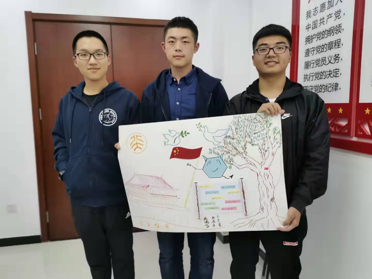 2019年10月19日上午,2班召开班会。班会以知识竞赛和集体创作的形式展开,根据中国共产党历史和党章出若干道选择题和填空题,同学以寝室为单位进行抢答,积极讨论交流,现场氛围非常活跃。在集体创作环节,班长拿出事先准备的印有国旗图案的广告版,同学们依次将自己想对祖国和党想说的话写在上面,表达对祖国母亲和中国共产党的热爱!