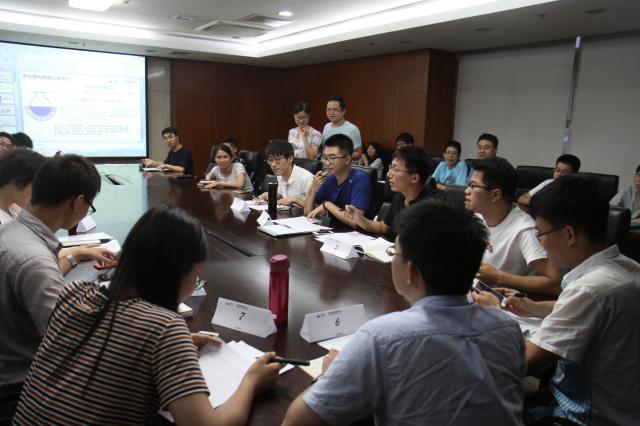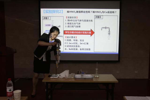 与此同时,在A717会议室内,由北京十二中教育集团校长李有毅、常务副校长王自勇、副校长史卫东、钱学森学校执行校长李鹏举等教学名师主持的化学课程试讲也在如火如荼地进行。10位预先报名、通过初筛的同学均精心准备了15分钟的课程试讲,他们精美的PPT、恰当的互动、多元的授课方式、卓越的风范为在场老师、同学们留下了深刻印象。首先登场的2014级博士生武秀琪以《盐类的水解》为主题,通过一个盐溶液PH测定的探究实验从宏观角度展现了盐类水解的过程,之后以盐和水的电离方程式从微观角度对盐类水解过程进行了本质揭示。2014级博士生谢佳君则通过基本四大反应引入课程,用生动的语言揭示了氧化还原反应的本质是存在电子的转移和偏移,随后通过不同难度的习题展示了氧化还原反应的可能存在的知识点与考点。2015级博士生赵银花将实验台搬到了讲台上,开始了稀硝酸和铜反应的课程。她以现场演示配合学生设计实验讨论,用创新的注射器实验代替了传统的玻璃瓶仪器,很好地将原本不能带入课堂的硝酸与铜反应的实验带入课堂。