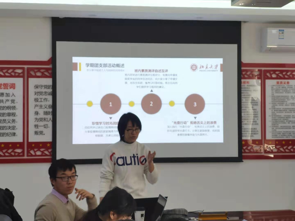 之后,各位团支书依次进行述职汇报。本学年度各支部继续严格按照团的组织要求,落实“三会两制一课”开展线上团系统维护、线下团关系转接及团费收缴等基础团务;团支书带头,支部团员跟进,结合国庆、抗疫、脱贫攻坚等时代热点,通过团支书讲团课、实践参访等形式扎实开展学习活动;培育团员青年榜样,进行推优入党,打造青年成长发展和自我建设的生力军。2020级本科团支书介绍了入学以来加强班级建设,促进同学交流熟悉,以团日活动为契机推进“支部到宿舍”的主要活动概况;2019级本科团支书特别介绍了暑期思政实践课程中以支部为单位,扎实开展线上参访、读书会等课程内容,带领同学们了解社会、读懂时代的难忘历程;2018级本科团支书回顾了疫情期间与湖北高中生开展“1对1帮扶”的过程,感慨支部成员从小事做起堪当时代责任,在实践中获得个人成长;2017级本科团支书介绍了未来一年结合同学毕业需求开展关心帮扶活动的主要设想;各研究生年级团支书介绍了结合各专业特点,以党建促团建的主要工作方法。