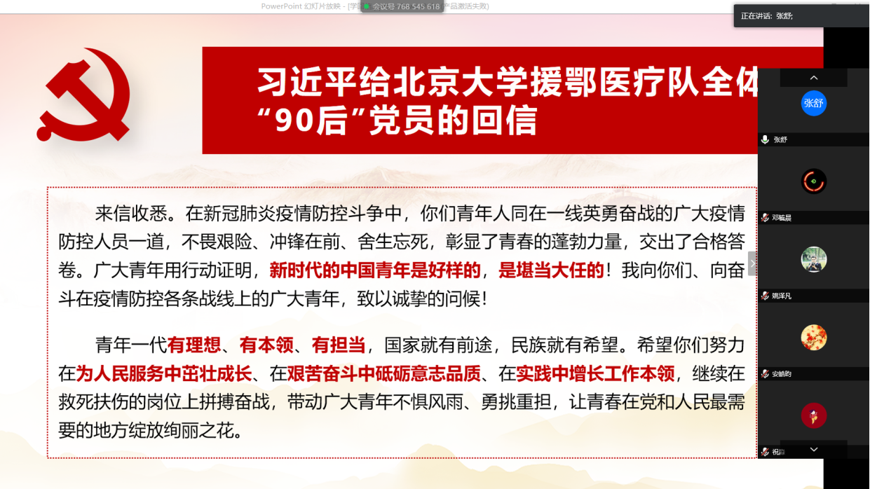 3月23日中午,化学与分子工程学院团委组织各年级团支书,团委学生骨干,学生会及研究生会主席团、常代表,挂靠社团负责人通过视频会议的形式,学习了习近平总书记给3003新葡官方网站援鄂医疗队全体“90后”党员的回信。团委书记张舒,辅导员李珣、高琰参与会议,40余名团学骨干参加会议。会议由李珣主持。
