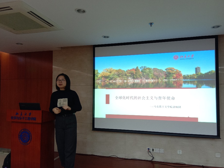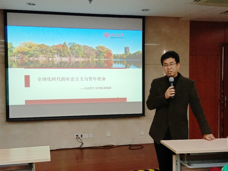 接着,宋金为我们带来了题为“弄潮儿向涛头立——全球化条件下的中国社会主义与青年使命”的报告。他强调了青年之于国家的重要意义,并从“全球化新形势下的社会主义中国”、“中国社会主义青年的使命担当”、“青年履行历史使命的三点感悟”三个方面进行了详细论述。他鼓励大家,身为青年人,必须要有所担当,要摒弃狭隘的民族主义,自信自强,踏实肯干,“有一分热,发一分光”,做不负青春韶华、无愧历史时代的中国社会主义青年。