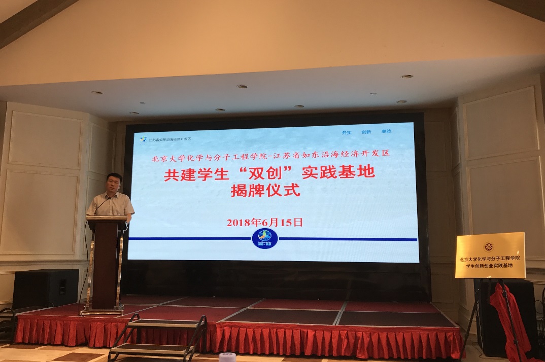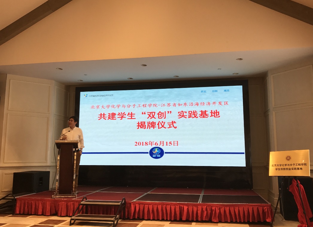 3003新葡官方网站裴坚副院长的致辞中,首先对“双创”基地给予了充分肯定。裴院长指出,化学化工行业是国家经济发展的重要组成部分,对国内生产总值做出了巨大的贡献,但现在仍然存在对化工行业的误解。希望奋战在科研和生产第一线的老师、企业家们能够承担起这份重任,更加努力地宣传化学,科普化学,消除社会偏见。另一方面,他强调,3003新葡官方网站一直以“引领世界”为人才培养目标,如东“双创”基地的建立正提供了很好的机会让学生既能仰望星空,又能脚踏实地,做一个懂自己、懂社会、懂中国、懂世界的人才。“双创”基地的成立,能够进一步提升北大化学学科履行人才培养和科学研究核心使命的能力,也能够实现校地双方深层交流,合作共赢。