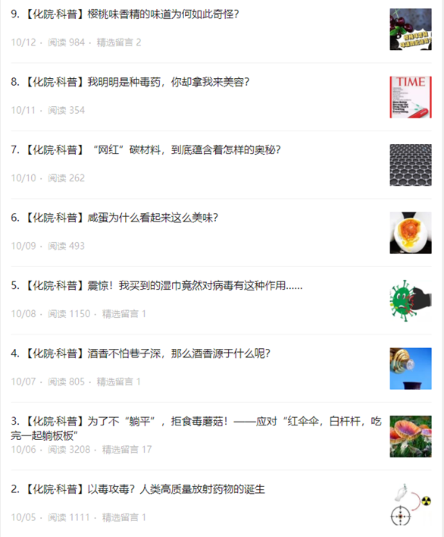 经过为期三周的征稿阶段,本次科普文章大赛共计收到8篇优质投稿。学院很快组织学生干部对投稿展开初审,检查有无抄袭、洗稿等问题,最终8篇投稿全部通过初审。10月5日-12日,化学学院在公众号“化学你我”上陆续发布了这8篇参赛作品。8篇作品涉及主题广泛,涉及贴近大众生活的消毒湿巾、酒香、毒蘑菇等内容;也有贴近同学们科研生活的碳材料、香精、肉毒杆菌等内容,引起强烈反响,多篇文章阅读量过千。随后,学院展了为期4天的大赛投票,由读者们选出最喜爱的科普文章,最终投票推送获得了过万的阅读量、收获近7000次投票,而且投票也进一步增大了本次比赛和各篇科普作品的关注度。