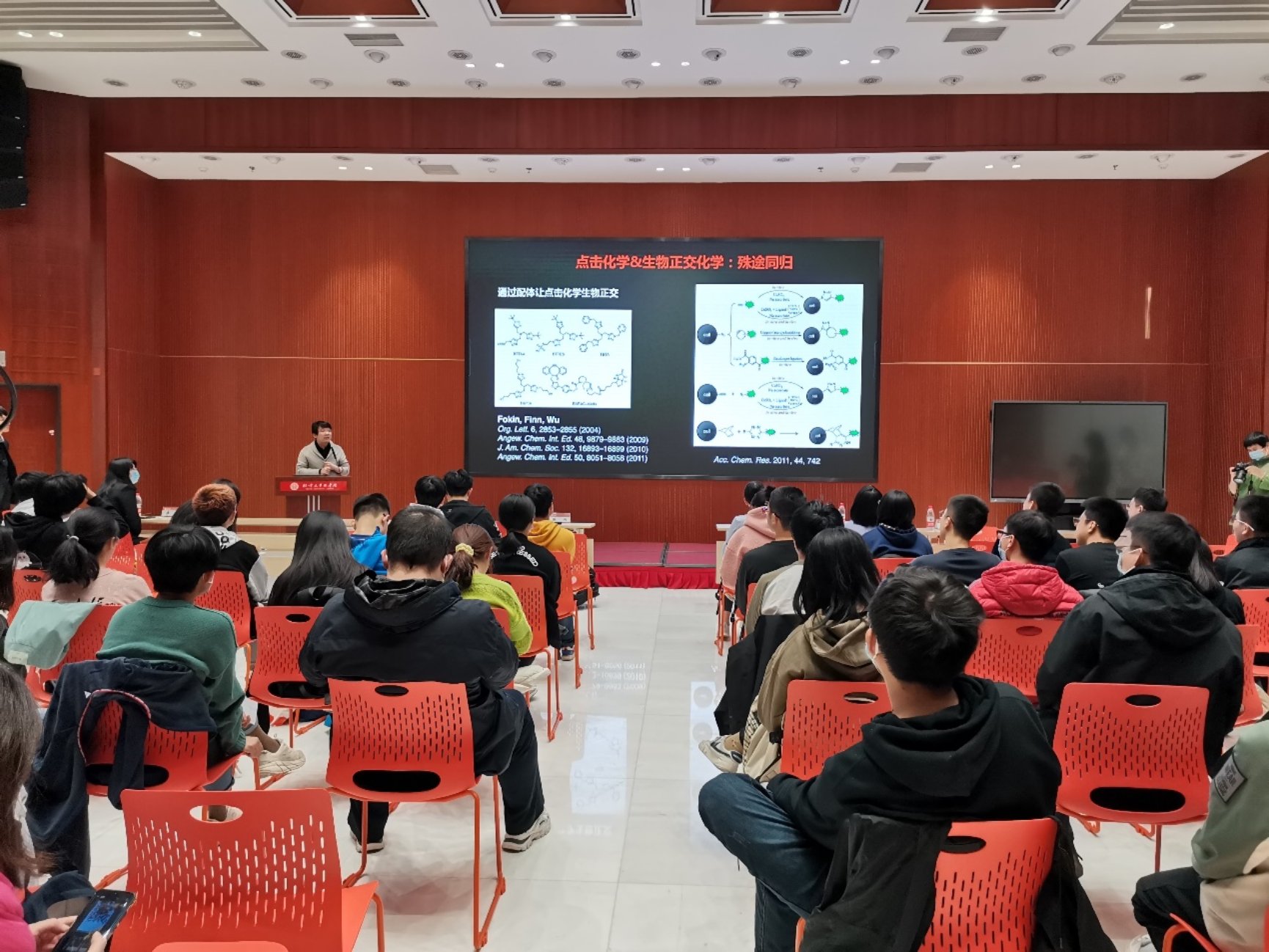 陈兴教授曾在卡罗琳·贝尔托西教授指导下获得博士学位。在讲座中,陈兴教授指出点击化学和生物正交化学是最近几十年来应用最为广泛的化学反应。其中,卡罗琳·贝尔托西教授为解决“糖质标记”的技术难题,开发了生物正交反应,成为了化学生物学领域最具代表性的工作之一。生物正交反应最大的特点是不干扰生命体系,同时不受生命体系的干扰。由于生命体系以水为溶剂,同时含有各种各样的化学活性基团,生物正交反应需要平衡生命体系的复杂性和生物标记的特异性这一对矛盾,其开发具有很高的难度。生物正交反应的出现和快速发展,为标记糖质以及蛋白、核酸等各类生物分子提供了一种全新的工具。