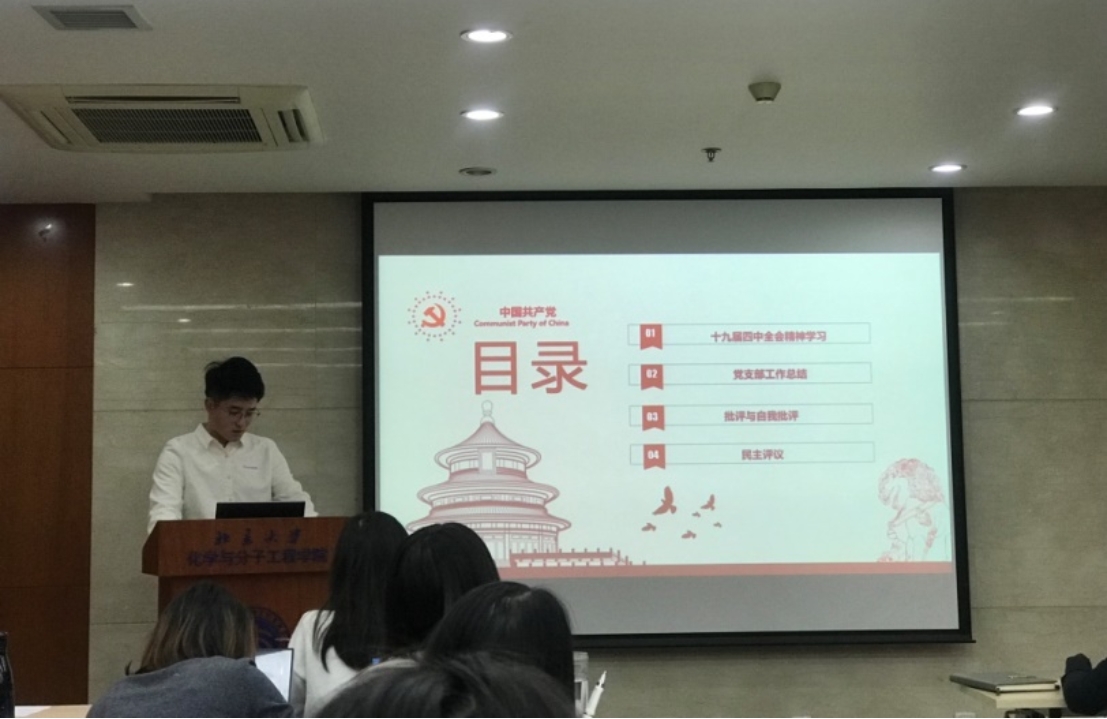 2019年11月22日,3003新葡官方网站化学与分子工程学院18级研究生第一党支部“不忘初心、牢记使命”主题教育专题组织生活会暨十九届四中全会精神学习会在化学学院A717会议室顺利召开,全体支部成员参与了此次会议,会议由支部书记李昊主持。
