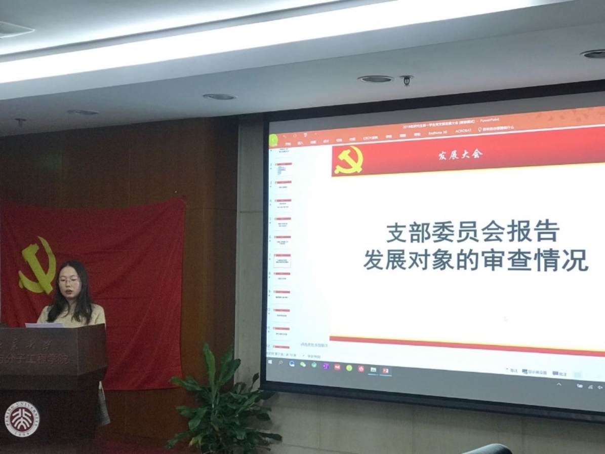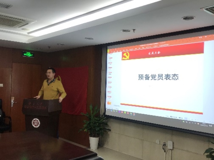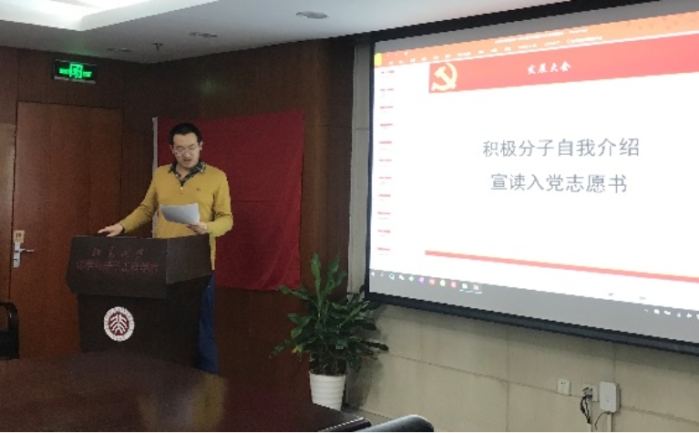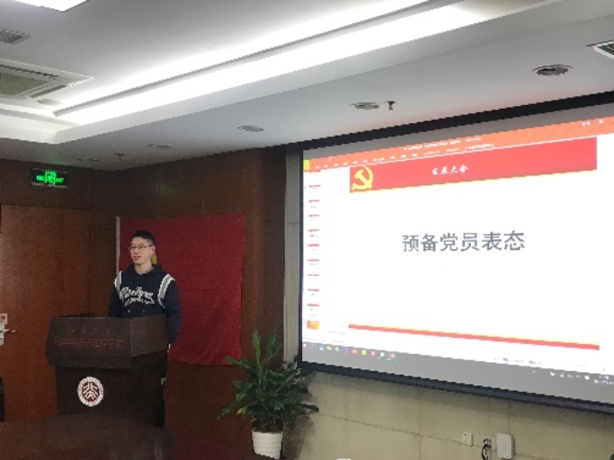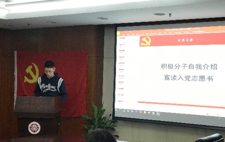大会开始,由申请入党人逐一进行入党志愿书的宣读以及自己的入党动机。申请入党的同学真情表达了自己对党的忠诚和向往,表示坚定不移跟党走,为党的工作付出自己的力量,为共产主义事业而奋斗终身。发展对象发言后,各对应入党介绍人对其进行学习、工作、实践活动等方面的评价,支部委员会报告各发展对象的审查情况,在场的其他党员同志也对他们提出了中肯的建议和希望。拥有表决权的党员对接受预备党员进行了举手表决,最终全体党员一致同意发展对象正式成为预备党员。