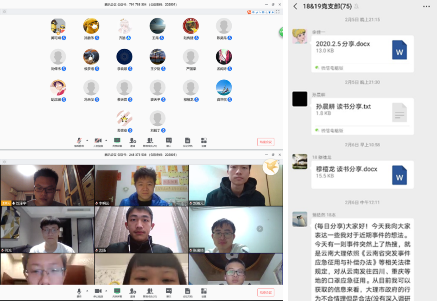 2020年2月1日起,在支部书记、专职辅导员侯梦旭的组织下,支部线上活动全面铺开:同学们成立学习小组,制定读书计划,以个人、小组、支部为单位进行阶段性汇报、交流,除支部必读书目《乡土中国》外,每组同学还有各自的自选书目,既有《中国历代政治得失》的底蕴,也有《红星照耀中国》的生动,也不乏《有闲阶级论》的理论性,对同学们提高自身党性修养十分有帮助。