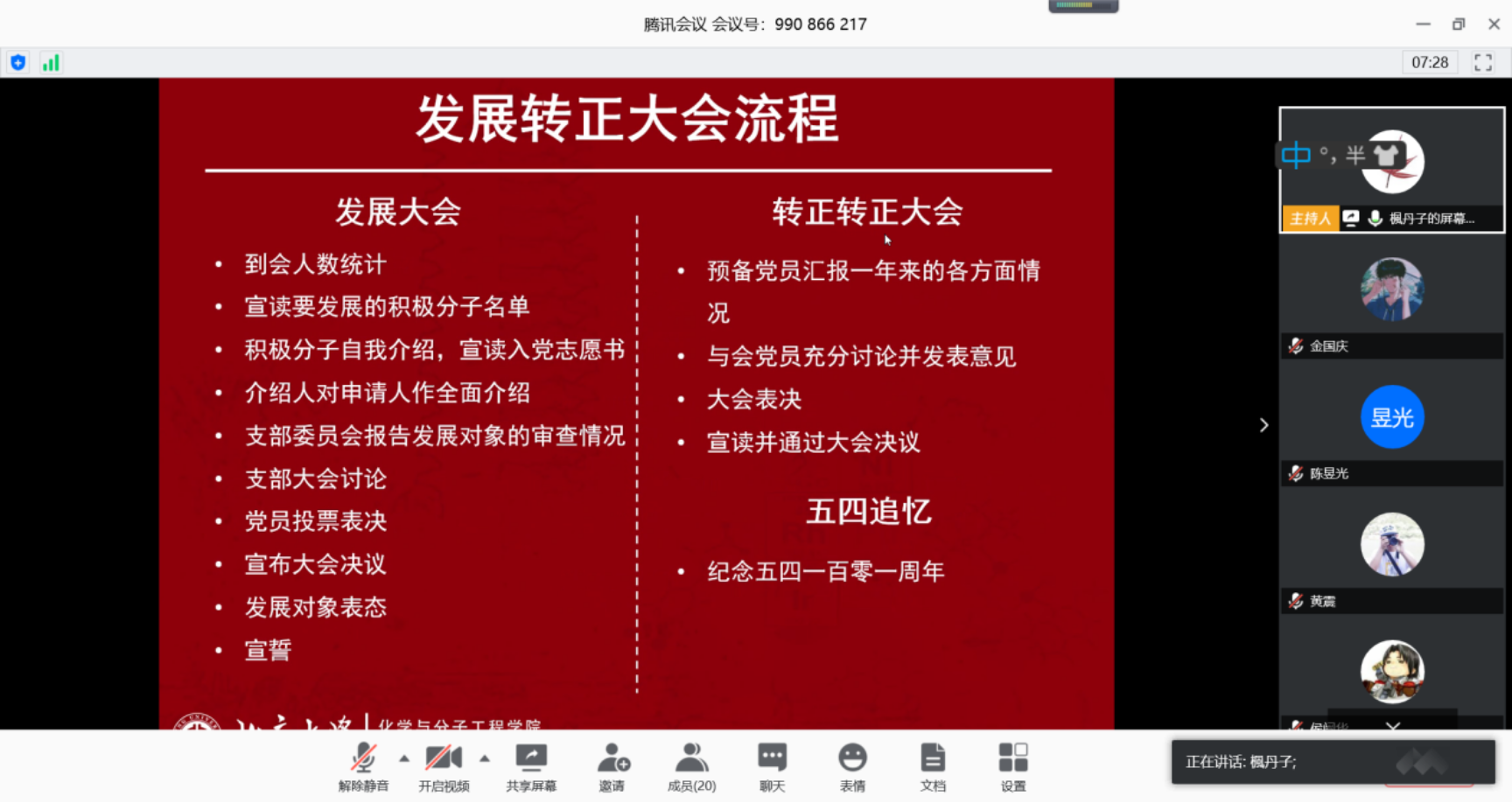 接下来举行了预备党员转正大会。陈煜楠同志汇报了作为预备党员一年以来的各方面情况。他结合各国对新冠肺炎疫情的应对情况,说明了社会主义制度的优越性等,阐述了对党的更深层次的理解。其入党介绍人刘威和赵雪表达了对陈煜楠同志良好评价,赞扬了他作为北大学子在抗击疫情中的青年先锋作用以及优秀的学习科研能力。结合全体参与党员投票情况,支部书记张攀宣读了同意陈煜楠同志的转正申请。