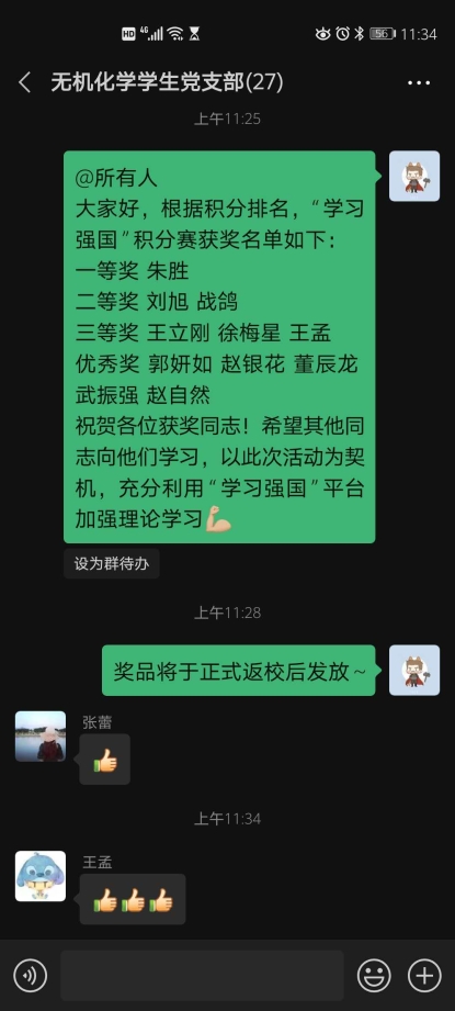 此次积分赛活动大大激发了各位支部成员的积极性,使各位党员更加深入地体会了我国在此次疫情中体现出来的制度优势。无机化学学生党支部将以此次活动为契机,继续推进支部理论学习常态化、制度化。