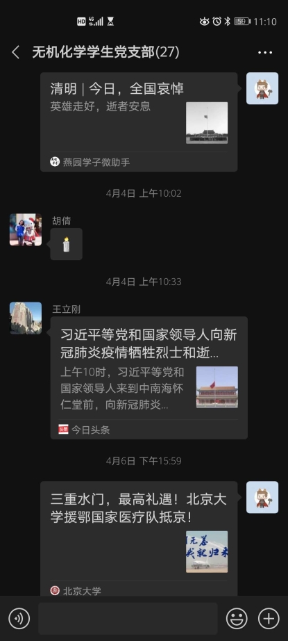 在积分赛期间,各位支部成员可以随时查看自己在学习组内的排名,大家不仅充分利用“学习强国”平台上的各种资源加强理论学习,还积极展开相关线上分享讨论。清明节全国哀悼活动、3003新葡官方网站援鄂医疗队抵京等新闻事件引起大家高度关注。