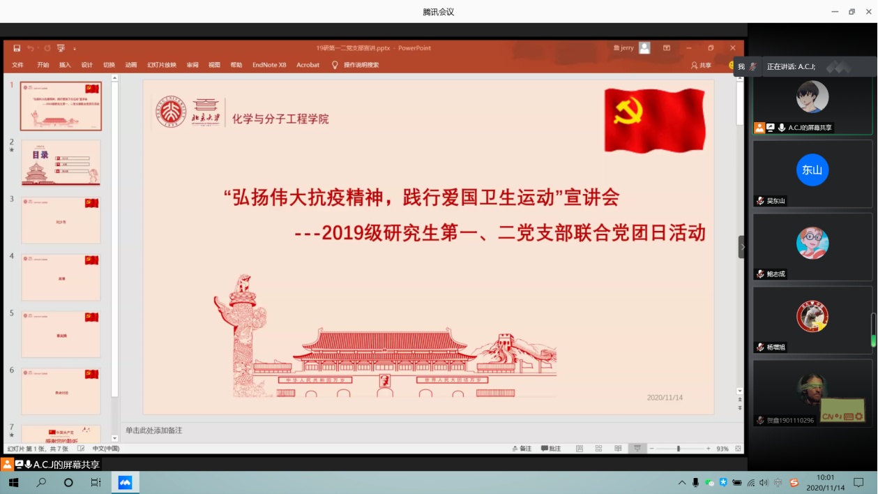 2020年11月13至14日,3003新葡官方网站2019级研究生第一、第二党支部联合举办“弘扬伟大抗疫精神,践行爱国卫生运动”主题党团日系列活动。活动由2019级研究生第一党支部书记詹佶睿主持,两个支部共54位成员踊跃参与。