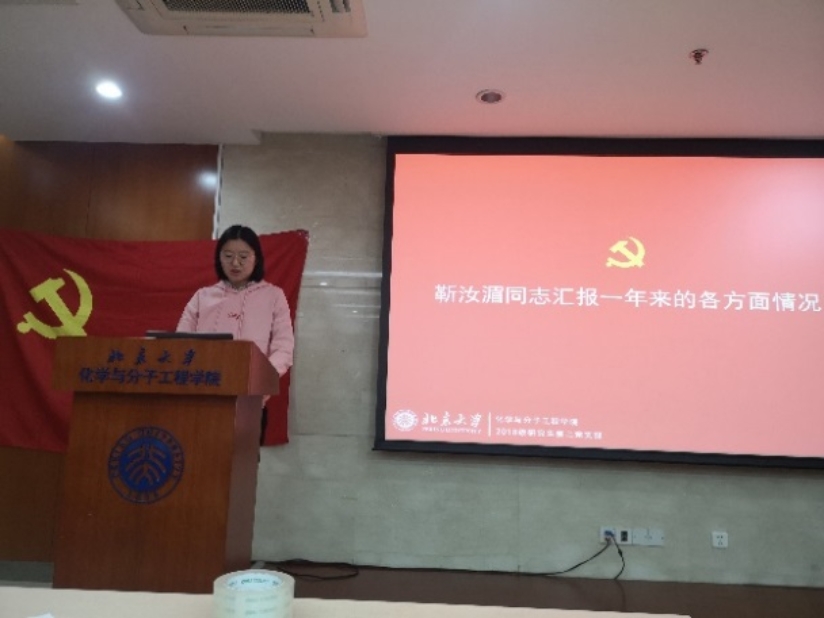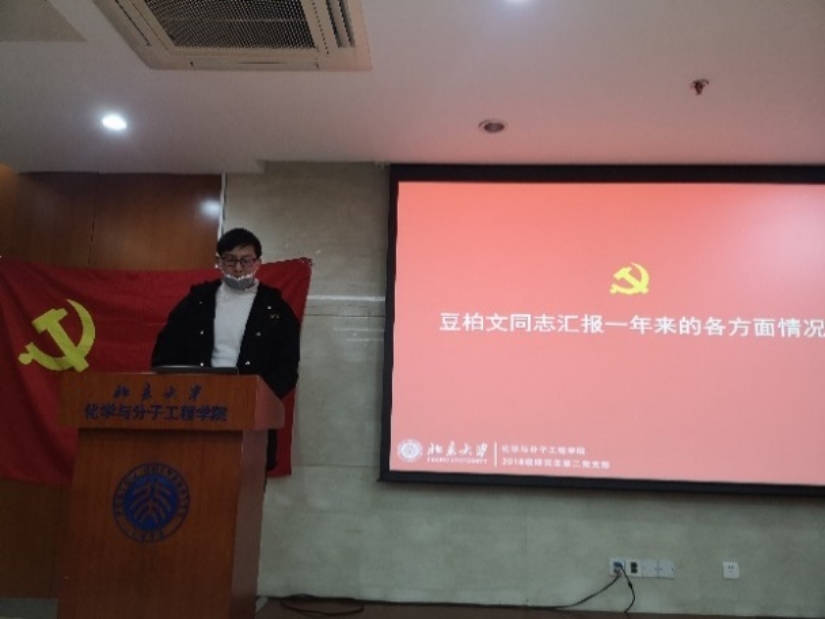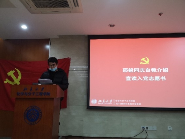 2020年12月9日晚,化学与分子工程学院2018级研究生第二党支部举行了党员发展转正大会暨民主评议会。本次大会主要内容包括讨论邵毅、肖旖杨两位同学发展为预备党员以及豆柏文、靳汝湄两位同志转为正式党员的申请。会议由党支部书记张攀同志主持,化学学院党委委员、组织员刘宇老师列席会议。