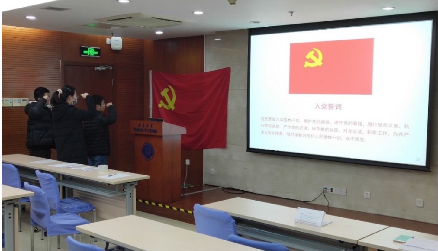 之后,参会的13位正式党员对两位同学的申请进行票决,宣传委员陈煜楠监票、组织委员丁静怡计票,均全票通过。两位同学表示将更加严格地要求自己,以优秀党员为榜样,努力提升个人党性修养,争取按期转为正式党员。在支部书记张攀同志的带领下,邵毅和肖旖杨面对党旗庄严宣读了入党誓词,正式成为预备党员。