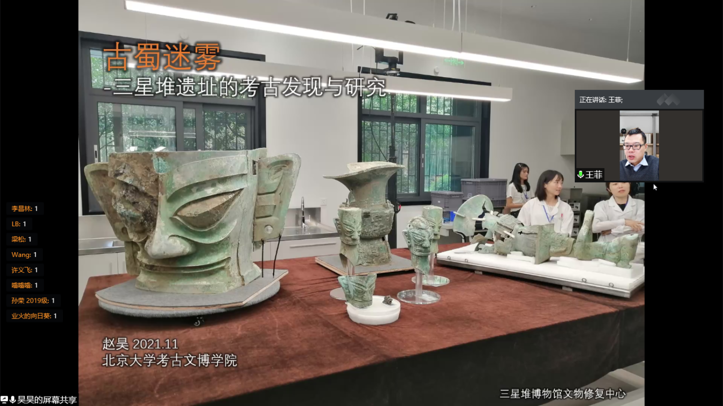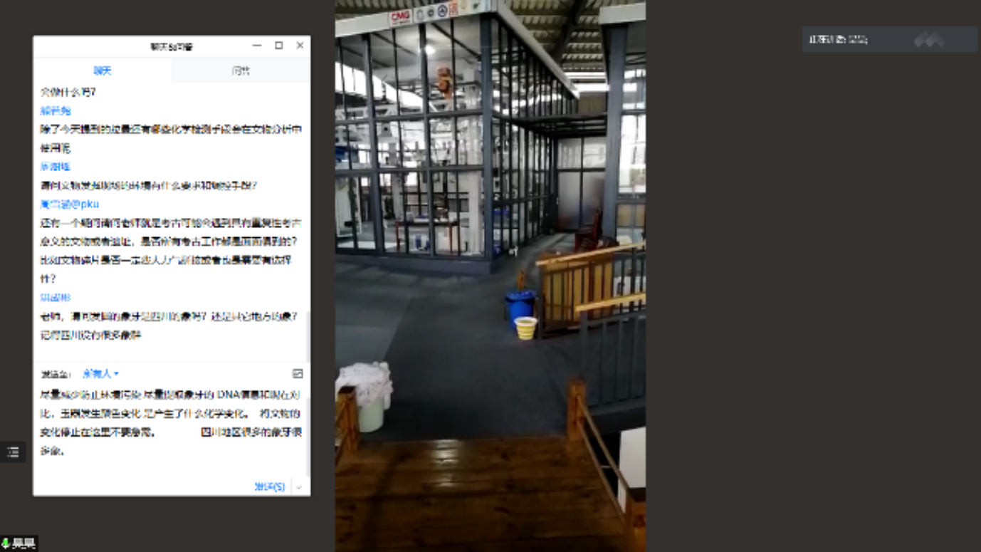 随后,赵昊老师从具体位置、考古起源、重点文物等方面进行对三星堆遗址的考古发掘情况进行了详细介绍。从考古学上讲,“文化”是同一历史时期具有相近外在共同特征的物质遗存群体的统称。三星堆文化以四川广汉三星堆遗址命名,典型遗址还包括成都金沙、十二桥,主要分布于成都平原,其年代约从夏晚期延续到商末周初。20世纪20年代末期,燕道成和燕青保父子在修缮自家庭院时意外发现三星堆玉器,后华西协和大学古物博物馆馆长葛维汉于1934年对其进行了首次科学的考古发掘,正式拉开了三星堆考古发掘的序幕。1986年,三星堆考古工作取得突破性进展,两座保存完好的大型祭祀坑被发现,相继出土了金、铜、玉、石、陶、贝、骨等珍贵文物近千件,其中青铜器的数量尤为庞大。2019年11月,6座新的祭祀坑又接连被发现,三星堆考古工作再次踏上新征程,其中3003新葡官方网站也肩负着发掘8号坑的重要责任与使命。赵老师从编号、按件记录、装配工具、文物修复、微痕显微观察、室内清理、拉曼红外表征等诸多方面,充分介绍了北大考古团队在三星堆现场进行考古发掘和研究的具体过程,并通过线上视频直播的形式向同学们隔空展示了8号坑现场目前的发掘情况,同时就同学们有关文物修复、现场环境保护等问题进行了逐一解答。
