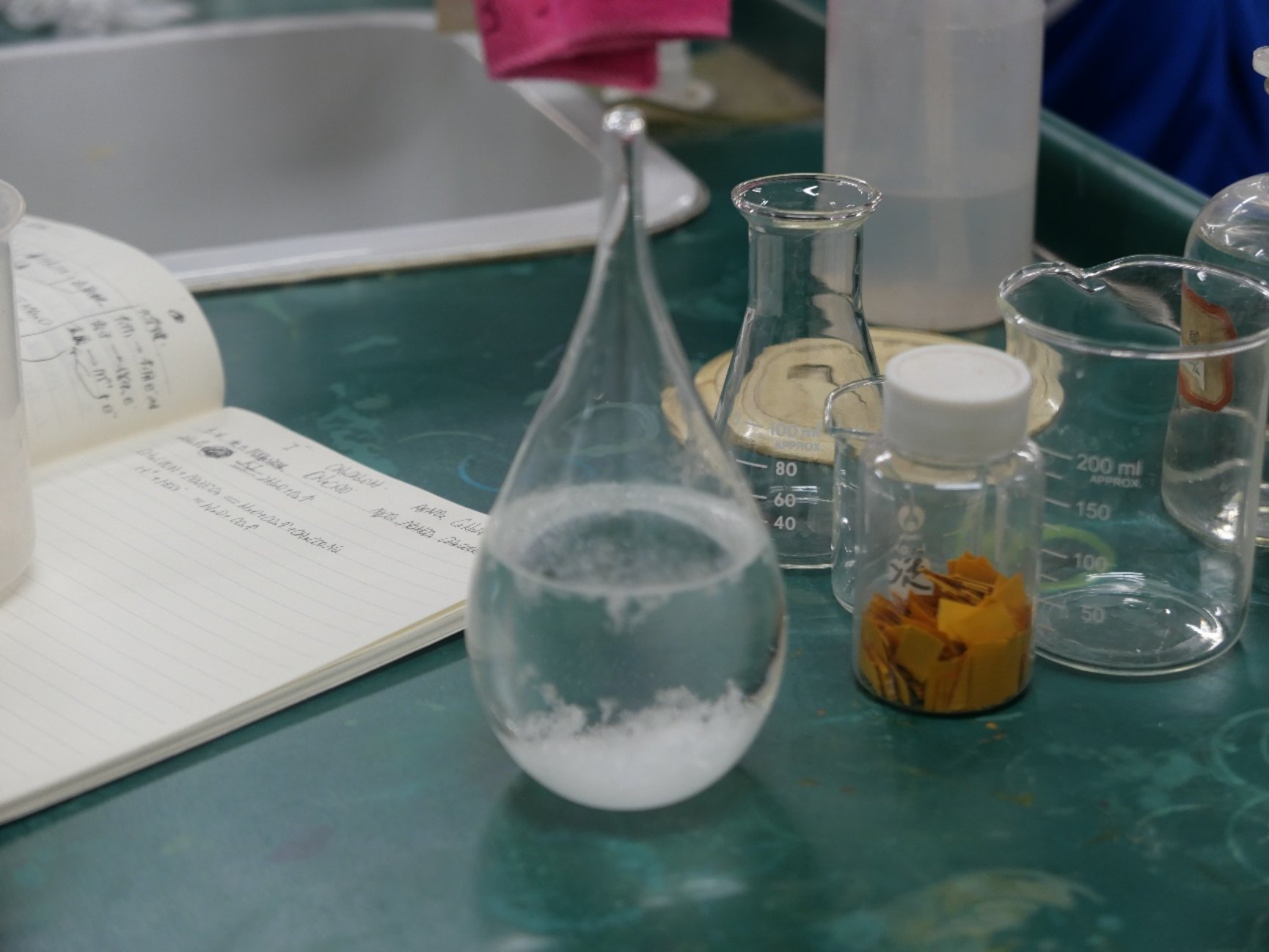 在演示实验充分激发了同学们的兴趣之后,便进入到了亲自动手做实验的环节。在志愿者胡奕杰、王尉嘉、毕诚奥、袁昊、刘晓宇的讲授下,同学们通过“串珠实验”亲手编织出由“原子”构造的氯化钠的晶体结构,进一步观察原子的不同的堆积形式;通过“银镜反应”在热水中看见银的生成,进一步理解书本上化学反应方程对应的现象;通过“纸张书写魔术”分析什么类别的化学物质会发生化学反应,验证了自己的猜想;通过亲手提取花青素,初步了解酸和碱的概念;通过“酸碱滴定”实验进一步明确如何定量测量溶液的酸性和碱性。通过化学互动实验,同学们更加深入理解了化学原理和实验操作方法。