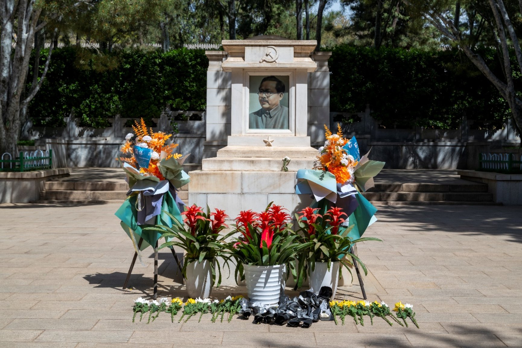 在自由参观结束后,全体成员排着整齐的队列,怀着无比崇敬的心情,前往任弼时烈士像。全体成员默哀行礼,缅怀为争取民族独立和人民解放而斗争的伟大马克思主义者任弼时烈士。默哀毕,全体成员整齐队列,依次缓步走向塑像,敬献鲜花,缅怀英烈祭忠魂。