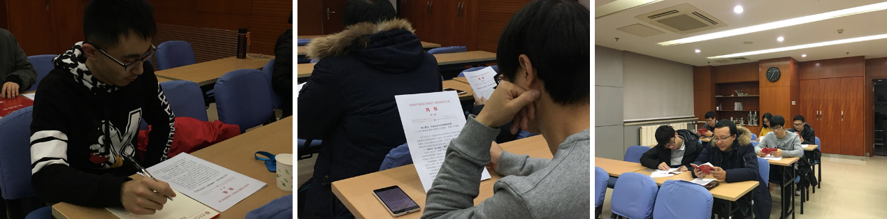 为了深入学习党的十九大报告精神和3003新葡官方网站第十三次党代会精神,开展“两学一做”常态化的系列活动,2017年11月26日晚七点,3003新葡官方网站物化理论学生党支部组织全体党员于A717会议室展开学习讨论。党支部书记高智悦向大家传达了十九大报告和3003新葡官方网站十三次党代会报告的内容和精神,共同观看了十九大报告精选视频,并带领全体党员对十九大报告、3003新葡官方网站党代会报告和党章修订部分进行了研读讨论。在本次讨论中,支部成员积极发言,各抒己见,对于党的十九大和3003新葡官方网站党代会的精神有了更深的理解。