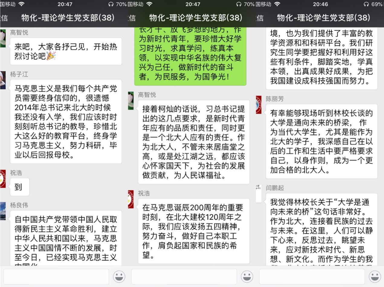 在一小时的在线讨论中,支部成员围绕马克思主义的内涵及意义、马克思同志的成长经历给予我们的启发和鼓舞、习近平总书记对青年学子的希冀、林建华校长在北大校庆120周年纪念大会上的讲话以及作为北大学子身上的责任展开了热烈的讨论,充分表达了观点。最后高智悦书记做出总结,她谈到“作为新时代的青年,作为新时代的北大学子,我们很幸运,但也重担在肩。希望各位同志能够身体力行,将我们所学所知应用到社会主义现代化建设中,为中华民族的伟大复兴贡献自己的力量。”