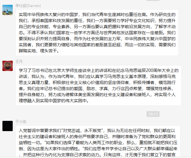“习主席在讲话中认为青年是国家的希望、民族的未来。希望新时代的青年人要爱国,忠于祖国,忠于人民;要励志,立鸿鹄志,做奋斗者……我认为这是党和国家对我们的高要求,也是对我们的高期望。这使人精神振奋,也使人压力倍增。作为新时代的新青年,我们首先要严于律己,提高自己的党性修养,学习知识,我们还要时刻牢记自己的责任与使命,牢记作为一名青年党员,应该以人民的幸福生活为己任,以国家的富强发展为己任。”胡杨同学说。