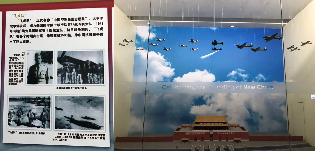 图一:支部同学在中国航空博物馆石碑前合影以及露天展馆所陈列的飞机及作战装备