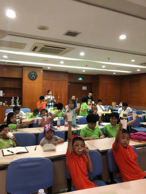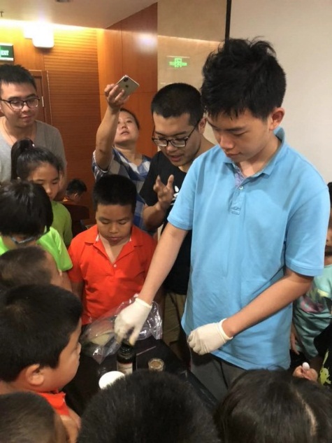 最后,支部成员给同学们演示了一系列趣味化学实验,让同学们感受化学的神奇。液氮冰激凌利用液氮的冷冻效果,让牛奶在几分钟变成可口的冰激凌;碘钟实验展示出了化学反应的可逆性,使得反应液有序的变换着颜色;大象牙膏则是依靠双氧水分解产生的气体产生大量泡沫,极具视觉效果。化学实验演示给小朋友留下了深刻的印象,也在他们心中种下了化学的种子。