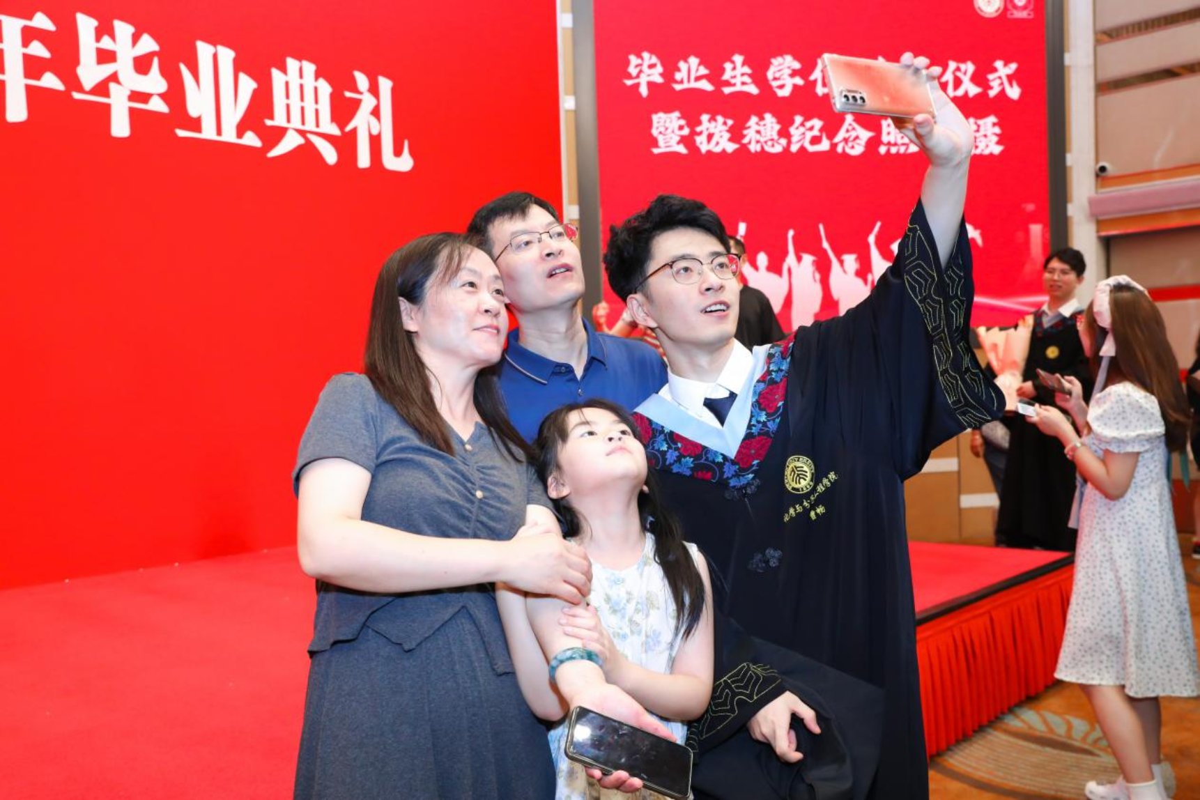 典礼结束后,裴坚、王颖霞为本科毕业生逐一拨穗并拍照留念,裴坚、甘良兵和彭海琳为研究生毕业生逐一拨穗并拍照留念。流苏划过头顶,既宣告着人生中一个重要阶段的结束,也代表了一个新篇章的开启。相机定格下此刻的回忆,为过往的欢笑与奋斗、泪水与汗水画上圆满的句号。骊歌唱响,拨穗礼成,愿毕业生此去迎风踏浪,直济沧海!