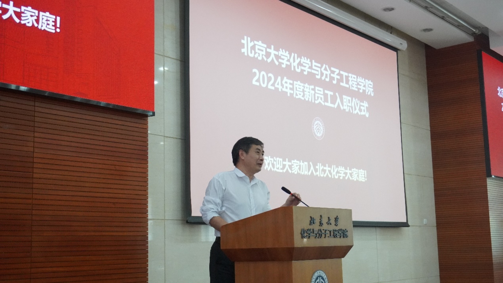 仪式伊始,化学学院党委书记裴坚代表学院对新近入职的同事们表示了诚挚的欢迎。他回顾了自己早年在新加坡国立大学担任博士后以及回国后建立实验室初期的经历,并以此勉励大家无论在学院的哪个岗位都要不惧挑战、大胆创新、茁壮成长,并预祝他们在新的工作岗位上取得优异的成绩,收获成功的喜悦。