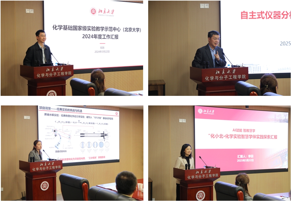 工作汇报和讨论环节由教学指导委员会主任朱成建教授主持。首先,实验中心主任邹鹏作2024年度工作汇报,从主要工作与成果、示范交流、未来发展等方面介绍了示范中心在过去一年所完成的实验教学及改革工作。随后,张新祥、徐金荣、李田三位老师分别围绕仪器分析暑期课程、物化实验数智化仪器开发、“化小北”AI教学平台建设进行了特色工作报告。仪器分析暑期课有效地将理论与实践相结合,以自由探索实验为主,鼓励学生根据兴趣开展课题,体验科研探究全过程;物化实验仪器智能化改造,通过引入人工智能与机器学习,将仪器功能自动化,优化了实验项目的体验;“化小北”AI智慧学伴平台的建设,将AI技术赋能化学实验教学,提高实验效率、助力学生成长,在化学实验教学领域发挥了引领示范作用。