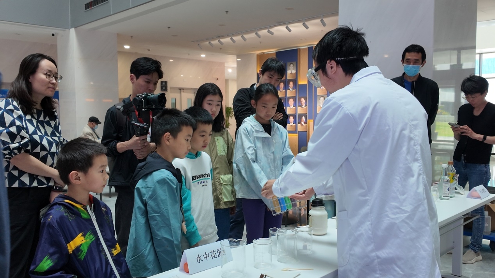 作为化学学院传承多年的特色活动之一,“化海拾贝”化学科普实验展吸引众多校友子女参与,其中变色饮料、碘钟反应、水中花园等趣味实验生动展现学科魅力。学生志愿者与来访校友及子女热情互动,现场氛围融洽,不少小朋友感受到化学的乐趣。