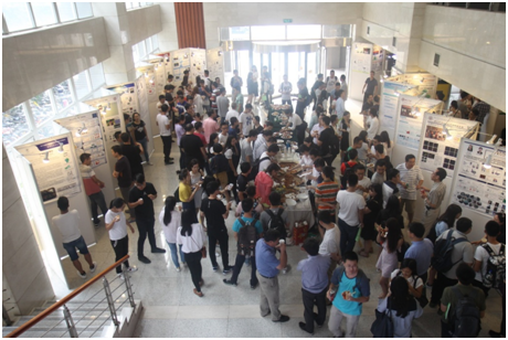 见面会后,2017级研究生来到A区大厅,参加新学期第一次专为新生准备的Happy Hour活动,同学们一边品尝着甜食饮品,一边驻足浏览各个课题组的介绍海报,并不时与各个课题组的老师和高年级的学长学姐交谈,更好地了解各个课题组的研究方向和组内情况。