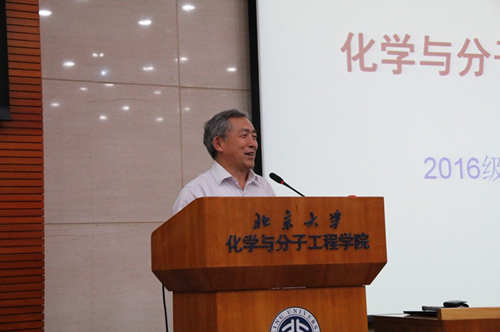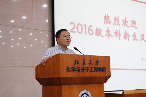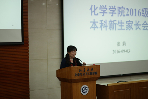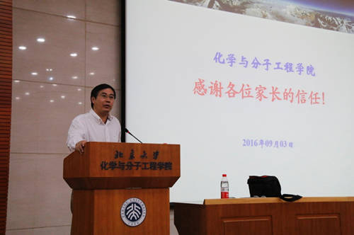 院党委书记刘虎威首先致辞。刘老师向各位家长表示了衷心的祝贺,并整体介绍了化学学院的师资队伍、科研情况及发展前景,并表示虽然化学学院在国际、国内的排名都处于领先地位,但我们仍要继续努力培养具有国际视野和竞争力的人才,培养学生健全的人格和科学的素养。这不仅需要教师的努力工作、学生的勤奋学习,更需要家长的关爱配合。