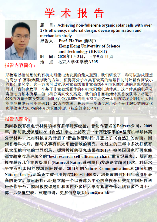 【学术报告】Achieving non-fullerene organic solar cells with over 17% efficiency: material design, device optimization and mechanism study