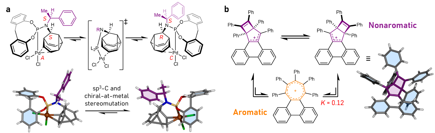 It is well-established that strain arises in organic molecules as a result of non-ideal bond lengths, bond angles, and unfavorable non-bonded interactions. The constrained geometries of ring systems are particularly predisposed to creating strain. Our recent research balances strain relief and geometry constraint to “switch-on” dynamic processes.1 This talk will summarize our investigations2 of fluxional carbon cages, which can give rise to phenomena such as dynamic preferential crystallization and stimulus-responsive dynamic sp3-C stereochemistry (Figure 1a). It will also describe our discovery3 of an aromatic-to-nonaromatic that emerges when the aromatic stabilization energy of a ring system is offset precisely by steric strain (Figure 1b).