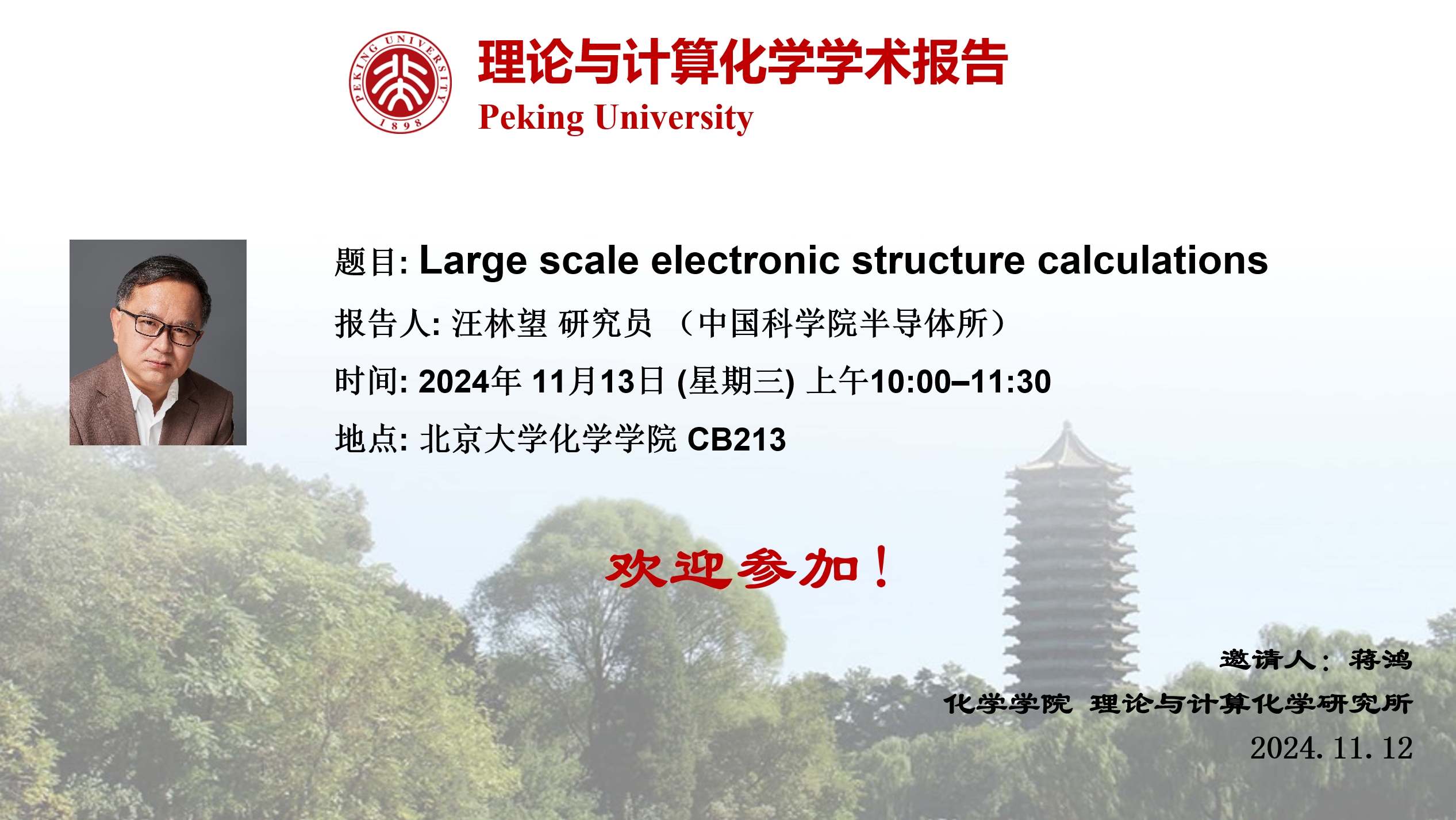 汪林望,男,1985年本科毕业于上海交通大学;1991年毕业于美国康奈尔大学,获得理学博士学位。1992-1999年,任职于美国再生能源实验室,分别担任博士后以及研究员职位。1999-2021年,任职于美国劳伦斯伯克利国家实验室,担任研究员与资深研究员职位。2022年至今,担任中国科学院半导体所研究员。汪林望博士主要从事大规模材料计算的算法研究,在半导体低维结构、计算材料科学以及能源材料科学等多方面取得了多项具有国际重要影响力的原创性研究成果,发展了包括已被广泛使用的PEtot、Escan、LCBB、LS3DF等在内的十多种算法和材料计算与器件模拟程序,于2006年荣获美国物理学会会士(APS Fellow),2008年获得国际高性能计算应用领域最高奖“戈登•贝尔”奖。汪林望至今共发表SCI论文400余篇,包括10篇Science和Nature,80余篇PRL、JACS和NanoLett 级别论文。论文总引用次数达40000余次,H-index为100。