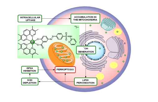 Despite significant improvements in the treatment of cancerous tumors in the last decades, cancer remains one of the deadliest diseases worldwide. To overcome the shortcomings of currently applied chemotherapeutic treatments, much research efforts have been devoted towards the development of ferroptosis inducing anticancer agents. Ferroptosis is a newly described form of regulated, non-apoptotic cell death that is associated with high potential inside the clinics. Herein, the chemical synthesis and biological evaluation of a Co(III) polypyridine sulfasalazine complex as a ferroptosis inducer is reported. Upon entering the cancerous cells, the metal complex primarily accumulated in the mitochondria, triggering the production of hydroxy radicals and lipid peroxides, ultimately causing cell death by ferroptosis. The compound demonstrated to eradicate various monolayer cancer cells as well as colon carcinoma multicellular tumor spheroids. To the best of our knowledge this study reports on the first example of a Co(III) complex that is capable of inducing ferroptosis.[1] To further enhance the therapeutic potential of the metal complex, the compound was encapsulated into polymeric nanoparticles. The nanomaterial was found to eradicate various monolayer cancer cells as well as colon carcinoma multicellular tumor spheroids at low concentrations.