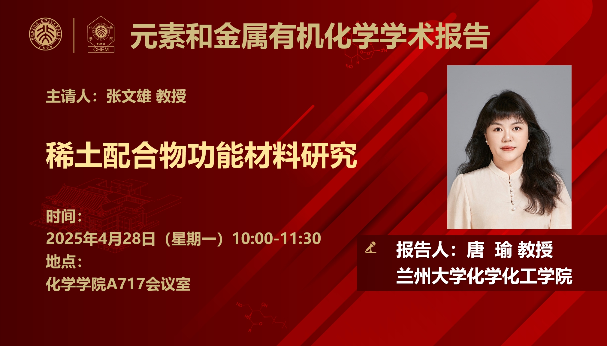 唐瑜, 兰州大学二级萃英学者 ,博士生导师。 教育部长江学者特聘教授,基金委稀土功能材料创新研究群体负责人,中国化学会会士, 英国皇家化学会会士, 国务院政府特殊津贴专家。兼任国务院学位委员会第八届化学学科评议组成员, 中国化学会副秘书长,中国化学会无机化学学科委员会 、 科普工作委员会 、 女化学工作者委员会委员; Aggregate 期刊顾问 编委, ACS 期刊 Inorg. Chem. 副主编 Inorg. Chem. Front. 、 《中国稀土学报》( 中、英文版 )、 《高等学校化学学报》(中英文版)、 《无机化学学报》 和 《结构化学》等期刊编委。近期的研究工作主要集中在 稀土 配位化学和功能材料研究,主持国家自然科学基金创新研究群体项目、重点项目和面上项目, 111 引智基地项目,甘肃省重大专项、 重点研发计划和企业合作 项目等研究课题。 以通讯作者或第一作者在 Acc. Chem. Res. 、 Natl. Sci. Rev. 、 Angew. Ch em. Int. Ed. 、 J. Am. Chem. Soc. 、 Energy Environ. Sci. 、 Adv. Mater. 、 ACS Nano 和 Sci. China Chem. 等刊物发表论文 200 余篇。 获 2024 年全国三八红旗手荣誉称号、 甘肃省自然科学一等奖 、 中国化学会首届“利华益”化学创新奖、 甘肃省研究生教育优秀导师、甘肃省高等学校教学 名师奖、霍英东青年教师奖、宝钢优秀教师奖、 兰州大学十佳导学团队、 兰州大学“我最喜爱的十大教师 ”等奖项。