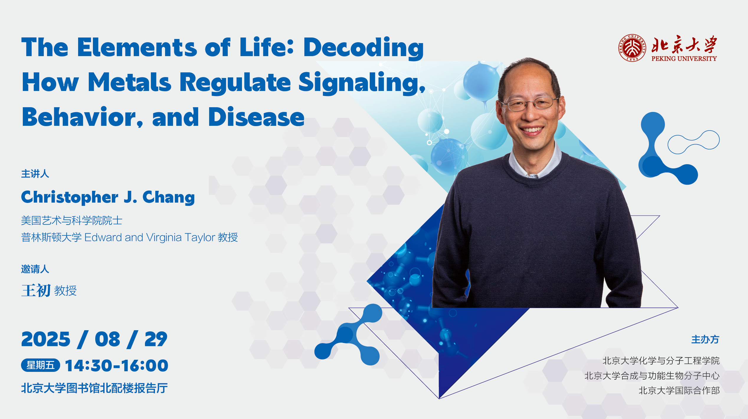Christopher J. Chang, 男,美国艺术与科学院院士,普林斯顿大学 Edward and Virginia Taylor 教授。Christopher J. Chang 于1997年获得加州理工学院学士学位,2002年获得麻省理工学院博士学位,2002-2004年在麻省理工学院进行博士后研究,于2004年加入加州大学伯克利分校化学系任教,2024年加入普林斯顿大学化学系。Christopher J. Chang 教授是活性传感技术(activity-based sensing)的奠基人和开拓者,将活性传感技术发展成为可用于活体、实时、原位检测过渡金属、活性氧和一碳代谢物的通用检测平台,并在神经病变、癌症和代谢紊乱疾病中,揭示了金属和氧化还原信号的独特作用机制。