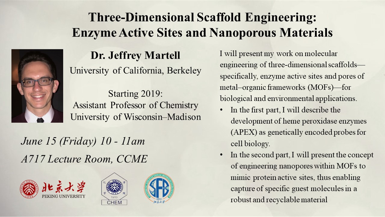 Dr. Jeffrey Martell will join the Department of Chemistry at University of Wisconsin-Madison in 2019. He is currently a Miller Institute Research Fellow in the Department of Chemistry at University of California, Berkeley. He was an NDSEG fellow and NSF Graduate Research Fellow, and received his Ph.D. from Massachusetts Institute of Technology for studying chemical biology and developing genetically encoded probes for cell biology. His current research focuses on engineering nanopores within metal-organic frameworks to mimic protein active sites.