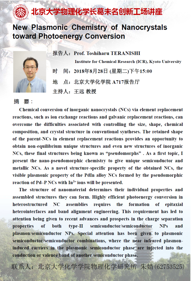 报告人:Prof. Toshiharu TERANISHI Institute for Chemical Research (ICR), Kyoto University 时 间:2018年8月28日 (星期二)下午15:00 地 点:3003新葡官方网站化学院 A717报告厅 主持人:王远 教授
