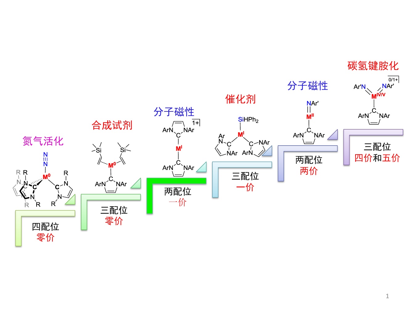 低配位过渡金属物种被认为是金属有机催化和小分子活化反应中行使化学键配位活化的活性金属物种。由于其高反应活性,低配位过渡金属配合物的合成和分离较为挑战。为探索低配位铁钴配合物的结构与反应性的关联这一科学问题,我们以氮杂环卡宾为配体开展了低配位铁钴配合物的研究。本报告将介绍我们以单齿卡宾为配体来探索低配位低价和低配位高价铁钴配合物的合成、结构和反应性质方面所取得的进展。 在低配位低价配合物研究方面,我们发展了以大位阻碳基配体稳定低配位低价铁钴物种的策略,实现了两配位、三配位零价和一价铁钴配合物稳定合成,创制了新颖零价铁钴配合物合成试剂;在低配位高价配合物研究方面,实现了四价和五价钴亚胺基配合物的合成,发现低配位后过渡金属亚胺基配合物活化C-H键的多态反应性以及高价态并不能保证其发生C-H键胺化反应的高反应活性规律。