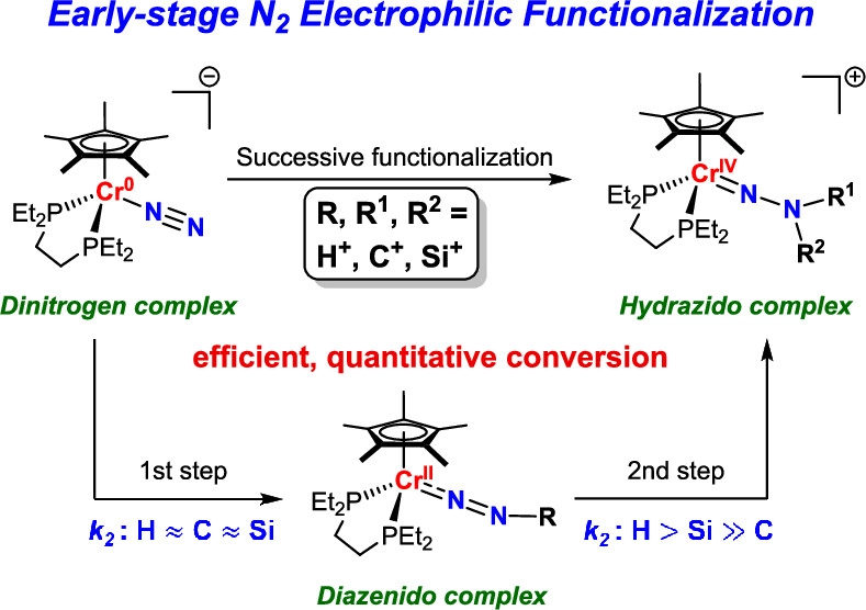 Electrophilic functionalization of N2 moieties in metal dinitrogen complexes typically initiates the catalytic synthesis of N-containing molecules directly from N2. Despite intensive research in the last six decades, how to efficiently and even quantitatively convert N2 into diazenido and hydrazido species still poses a great challenge. In this regard, systematic and comprehensive investigations to elucidate the reaction intricacies are of profound significance. Herein, we report a kinetic dissection on the first and second electrophilic functionalization steps of a new Cr0–N2 system with HOTf, MeOTf, and Me3SiOTf. All reactions pass through fleeting diazenido intermediates and furnish long-lived final hydrazido products, and both steps are quantitative conversions at low temperatures. All of the second-order reaction rates of the first and second transformations were determined as well as the lifetimes of the intervening diazenido species. Based on these findings, we succeeded in large-scale and near-quantitative preparation of all hydrazido species.