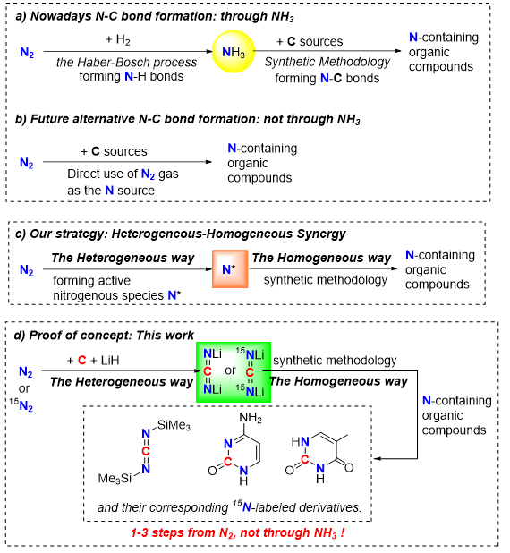 The element nitrogen and nitrogenous compounds are vital to life. The synthesis of nitrogen-containing compounds using dinitrogen as the nitrogen source, not through ammonia, is of great interest and great value but remains a grand challenge. Herein, we describe a strategy to realize this transformation by combining the heterogeneous approach with the homogeneous methodology. The N2 molecule was first fixed with carbon and LiH through a one-pot heterogeneous process, forming Li2CN2 as an ‘activated’ nitrogen source with high efficiency. Then subsequent homogeneous treatments of Li2CN2 to construct the organic synthon carbodiimide and the RNA/DNA building block pyrimidines were fulfilled. By using 15N2 as the feedstock, their corresponding 15N-labeled carbodiimide and pyrimidines were readily obtained. This homogeneous-heterogeneous synergy strategy will open a new chapter for N2 transformation.