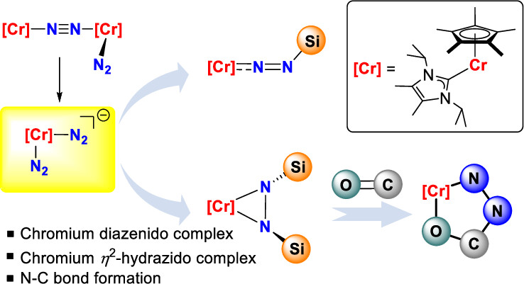 Isolation of key intermediate complexes in dinitrogen functionalization is crucial for elucidating the mechanistic details and further investigation. Herein, the synthesis and characterization of (μ-η1:η1-N2)(η1-N2)-Cr(I) 3 and (η1-N2)2-Cr(0) complexes 4 supported by Cp* (Cp* = C5Me5) and NHC ligands were reported. Further functionalization of Cr(0)-N2 complex 4 with silyl halides delivered the key intermediates in the alternating pathway, the chromium diazenido complex 5 and the chromium side-on η2-hydrazido complex 6. Protonation of 6 led to the quantitative formation of N2H4. Moreover, the [η2-Me3SiNNSiMe3]2– unit in 6 enabled N–C bond formation reactions with CO2 and tBuNCO, giving the corresponding N,O-chelating hydrazidochromium complexes 7 and 8, respectively.