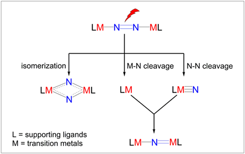 The Haber-Bosch process, which is used for ammonia (NH3) synthesis, requires vast amounts of energy, accounting for approximately 1%—2% of the world's annual energy consumption. Therefore, researchers in both industry and academia are interested in developing sustainable and environmentally friendly methods for synthesizing nitrogenous compounds at ambient conditions using renewable energy sources such as visible light. While several examples of thermal activation of dinitrogen molecules have been demonstrated using various transition metals and ligand frameworks, the use of light to weaken or split the strong N—N bond has been less explored. This article presents an overview of molecular complexes capable of dinitrogen photocleavage and provides mechanistic insights into the photoactivation process through experimental and theoretical studies. We believe this review will provide readers with an in-depth understanding of the current state-of-the-art and future research perspectives, particularly in the use of visible light for dinitrogen activation and transformation.