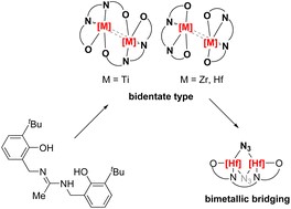 A N-aryloxide-amidine ligand (H3L), integrating phenoxide (PhO−) and amidine ligands through methylene linkers, has been synthesized from 2-(aminomethyl)-6-(tert-butyl)phenol in two steps. Upon reacting the deprotonated H3L ligand with group 4 metal chloride MIVCl4, a corresponding (LMIV–Cl)2 dimer could be obtained. The coordination modes exhibit variation depending on the radius of the metal ions. In the case of (LTiIV–Cl)2, the two ArO− arms from the same ligand bond to two different Ti(IV) centers, while in the case of (LZrIV/HfIV–Cl)2, both ArO− arms coordinate with the same metal center. Moreover, the two C–N bonds in the amidinate moiety are localized in (LTiIV–Cl)2, whereas they delocalize in (LZrIV–Cl)2. Notably, (LHfIV–Cl)2 could further react with one equivalent of HfCl4, yielding the binuclear metal azide in the presence of KN3 and LiCl, where the coordination mode of the amidinate moiety changed from the bidentate chelating type to the bimetallic bridging coordination.