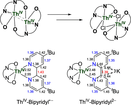 An N-aryloxide-amidine ligand (1), [ONNO] ligand, integrating phenoxide (PhO–) and amidine ligands through methylene linkers, was employed in actinide chemistry. Upon reaction of the deprotonated ligand with ThCl4(DME)2 in ether, the corresponding dimer complex 2 was obtained. Upon treatment of 2 with KCp* (Cp* = Cp(Me)5) in tetrahydrofuran, the corresponding {[ONNO]ThIVCp*(LiCl)}2 (4) was obtained. In complex 2, the two ArO– arms bonded from the same ligand to different ThIV centers. In contrast, both ArO– arms coordinated to the same metal center in 4. Notably, when a mixture of 2 and bipyridine was treated with one or two equiv of KC8, the [ONNO]ThIV-bipyridyl•̅ radical dimer complex (5) and [ONNO]ThIV-bipyridyl2– dianionic dimer species (6) were obtained, respectively.