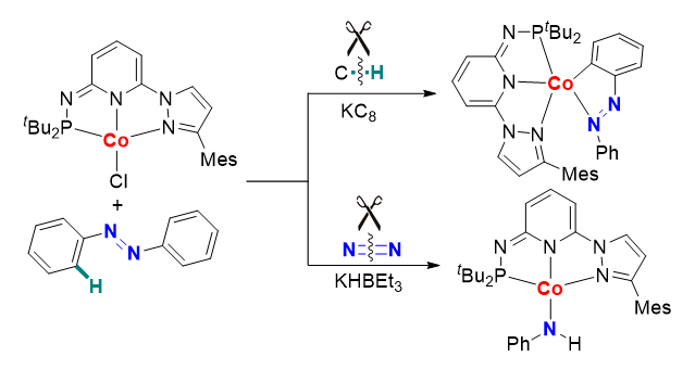 Nonsymmetric pincer complexes have received much attention due to their hemilability and more easily modulated spatial and electronic effects. However, their synthesis and reactivity studies remain considerably limited in comparison to symmetric pincer complexes. Common strategies to enhance the reactivity of complexes, such as reducing coordination sites or lowering metal center valences, invariably complicate synthesis. In this work, employing the strategy of introducing reducing agents, the PNNCoCl (1) (PNN: [6-(tBu2PN)C5H3N-2-(3-Mes)C3H2N2]) reacts with various small molecules to yield a variety of nonsymmetric pincer cobalt complexes, which were characterized by single-crystal X-ray diffractometry analysis and spectroscopy. The reaction of PNNCoCl, potassium graphite (or KHBEt3) with 1 equiv. of CNXyl (2,6-dimethylphenyl isocyanide) or carbon monoxide successfully yielded the monovalent cobalt complexes 2 (PNNCoCNXyl) and 3 (PNNCoCO) in 64% and 41% yields, respectively. Moreover, the reaction of complex 1 with N-heterocyclic carbene (1,3-diisopropyl-4,5-dimethyl-imidazol-2-ylidene), involving C—H bond cleavage and Co—C bond formation, afforded the corresponding divalent cobalt complex 4. Furthermore, by using different reducing agents, we achieved the modulation of the selective reaction of azobenzene C—H or N=N bonds. When KC8 (potassium graphite) was used as the reducing agent, the reaction of PNNCoCl and azobenzene in tetrahydrofuran afforded the azobenzene C—H bond-breaking product 5 in 53% yield. The cobalt atom is pentacoordinate in a tetragonal pyramid geometry. The N—N lengths of 0.12835(17) nm in complex 5 are in the range of normal N=N double bonds (0.122~0.130 nm). In contrast, the reaction of 1 with azobenzene in the presence of KHBEt3 gave the cobalt complex PNNCoNHPh (6), as confirmed by X-ray diffraction analysis. The structure suggests N=N double bond cleavage of azobenzene in the formation of the aniline complex. The N—H stretching bands of 6 were recorded at 3131 cm−1, and the solution magnetic moment was µeff = 2.2 µB. In addition, the treatment of complex 1 with 3,5-di-tert-butyl-o-benzoquinone in the presence of 1.2 equiv. of KC8 gave rise to the cobalt complex 7. X-ray diffraction analysis of 7 revealed that the PNN ligand and o-benzoquinone parts are linked by forming a P—O single bond. The o-benzoquinone was reduced to the catechol ion. Complex 7 exhibits a high-spin electronic structure (S = 3/2), as evidenced by the solution magnetic moment of 4.0 µB.