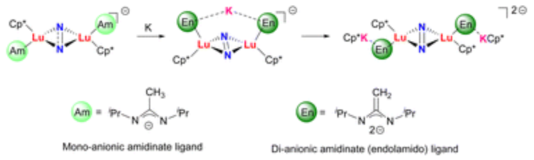 Selective deprotonation of the amidinate ligand in lutetium dinitrogen complex [{Cp*{MeC(NiPr)2}Lu}2(μ2-η2:η2-N2)][K(crypt)] (Cp* = (C5Me5)−, crypt = 2,2,2-cryptand) afforded the novel Cp*/enolamido lutetium dinitrogen complex [{Cp*{H2C=C(NiPr)2}Lu}2(μ2-η2:η2-N2)K][K(crypt)]. Due to the skeleton tension, a further rearrangement was confirmed with the formation of [{Cp*K{H2C=C(NiPr)2}Cp*Lu}2(μ2-η2:η2-N2)][K(crypt)]2.