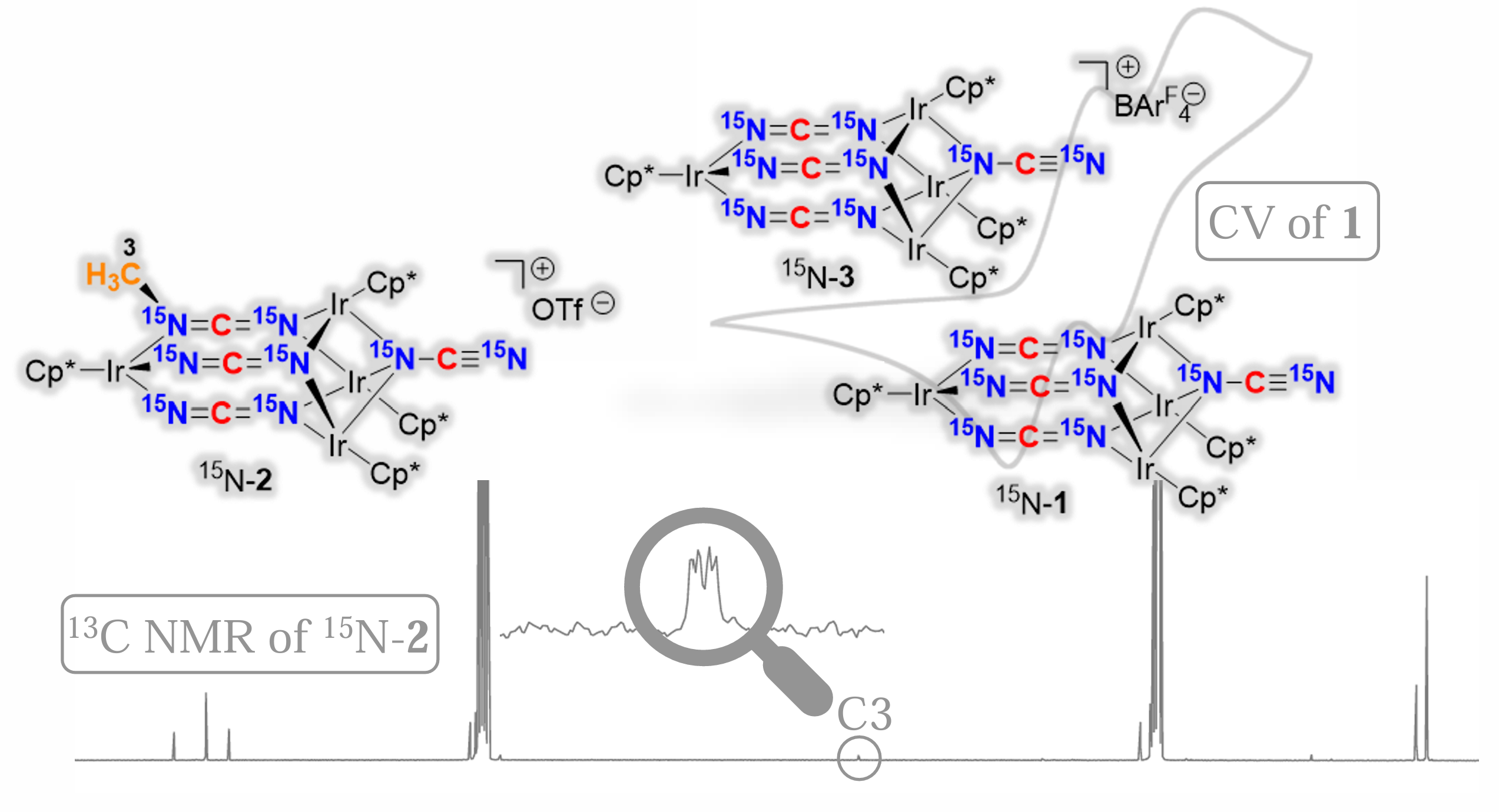 The synthesis of 15N-labeled organometallic complexes is challenging due to limited suitable 15N-labeled precursors. Herein, we report the preparation of a 15N-labeled tetranuclear iridium complex, 15N-1, from Li2C15N2, with nitrogen atoms originally from 15N2 gas. Mono-methylation and single-electron oxidation of 15N-1 yield the corresponding ate complexes, 15N-2 and 15N-3. These complexes were characterized by 1H, 13C, and 15N NMR spectroscopy and X-ray diffraction.