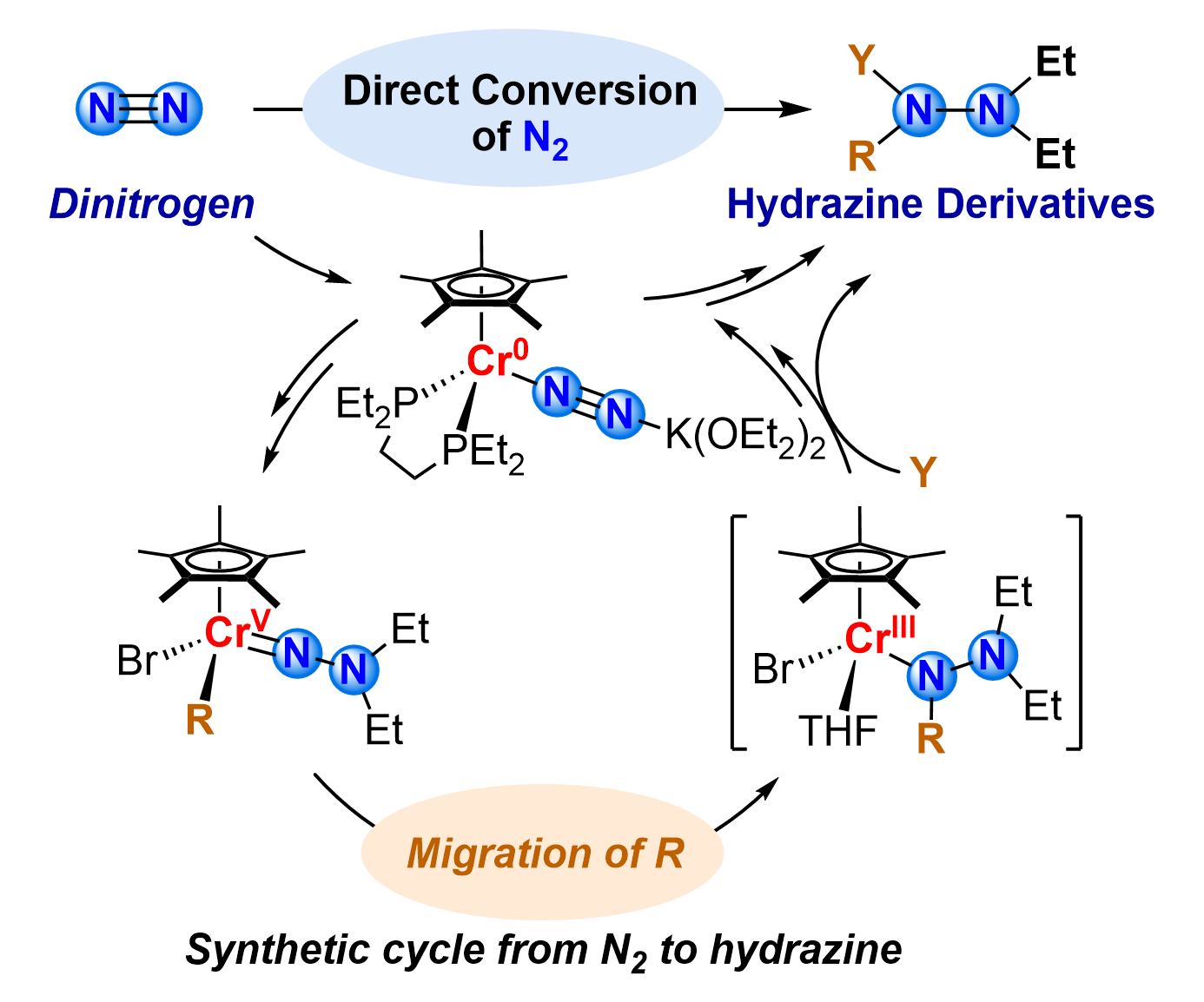 The direct conversion of N2 into N-containing organic compounds remains a fundamental challenge in synthetic chemistry. Here, we report a high-valent chromium(V)-mediated strategy for synthesizing multisubstituted hydrazine derivatives via ligand migration, representing ligand migration to Nα in a Cr-hydrazido complex. Our approach begins with the oxidation of chromium(IV) hydrazido precursor 1 by benzyl bromide, which replaces the 1,2-bis(diethylphosphino)ethane (depe) ligand with two bromide ions to generate the high-valent chromium(V) dibromide hydrazido complex 2. Sequential ligand metathesis of 2 with aryl Grignard reagents (ArMgBr, Ar = biphenyl, p-methylphenyl, o-methoxyphenyl), alkenyl or alkyl Grignard reagents (1-phenylvinylmagnesium bromide and isopropylmagnesium bromide), followed by ligand migration from the Cr center to the Nα atom and electrophilic trapping (MeOH, PhCH2Br), affords structurally diverse hydrazines (4a–c, 5a–c, and 6). Single-crystal X-ray crystallography, in situ UV–vis spectroscopy, and DFT calculations collectively reveal a ligand migration mechanism in chromium chemistry, directly forging N–C bonds from N2 without ammonia intermediates. This migration not only constructs new N–C bonds but also enables the direct construction of complex hydrazine structures directly from N2.